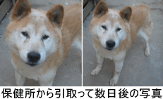 現場へ引取りに行った保健所の方の話では、体は臭く、酷く汚れ、まるでボロ雑巾の様で爪も延び、身動きをしなかったため、死んでいると思ったそうです。 数日間放浪し、空腹に耐えて過ごしていたと思われます。 フィラリア(重度の+)で予防歴も無く、身体に触れられることを嫌がり、人間を怖がる様子から、愛情を受けず、粗末に飼われていたと、推測していました。 |