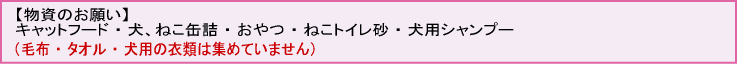 ※会場のスペース上と、参加する猫さんたちへの考慮、犬同士の喧嘩を引き起こす原因になりますので、 誠に申し訳ないのですが、(当会より譲渡した犬さん、猫さんを除き) 犬さん、猫さん連れてのご来場はご遠慮頂きますようお願い致します。 ブログ、HPをお持ちの方、上記内容の告知宣伝のご協力をお願い致します。 |