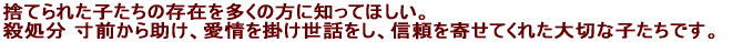 そして、助かっているのはごく一部の子だけです。 これからは幸せな生活を送って欲しい、私達の強い願いがあります。 里親希望者さんが犬や猫を「家族の一員」として健康管理を含め、大切に、終生世話してくれること が絶対条件としています。 里親希望者様が確かな「意志」を持っておられるか? これからの飼育状況など質問用紙に記入していただきます。 希望者様になんらかの不安要素が認められた場合や私共の希望対象にならない場合は、 申し訳ありませんがお断りさせていただきます。 一時的な感情や安易な選択は犬猫の犠牲を増やす結果になるためとご理解願います。 ![]() 資金不足のため、医療費の未払いが続き、子猫用粉ミルク、子猫用フード、子猫用哺乳器、犬用のフードが買えない情況となっています。 会場にて寄付金、物資を募集しています。 物資支援の詳細 ご縁が無く、家族と巡り合えていない保護犬さん猫さんがいます。 里親のご検討をお願いします。 芸が得意な子達ではありません。 信頼関係を一番に考えて接してくださる良心的な方を希望しています。 ![]()